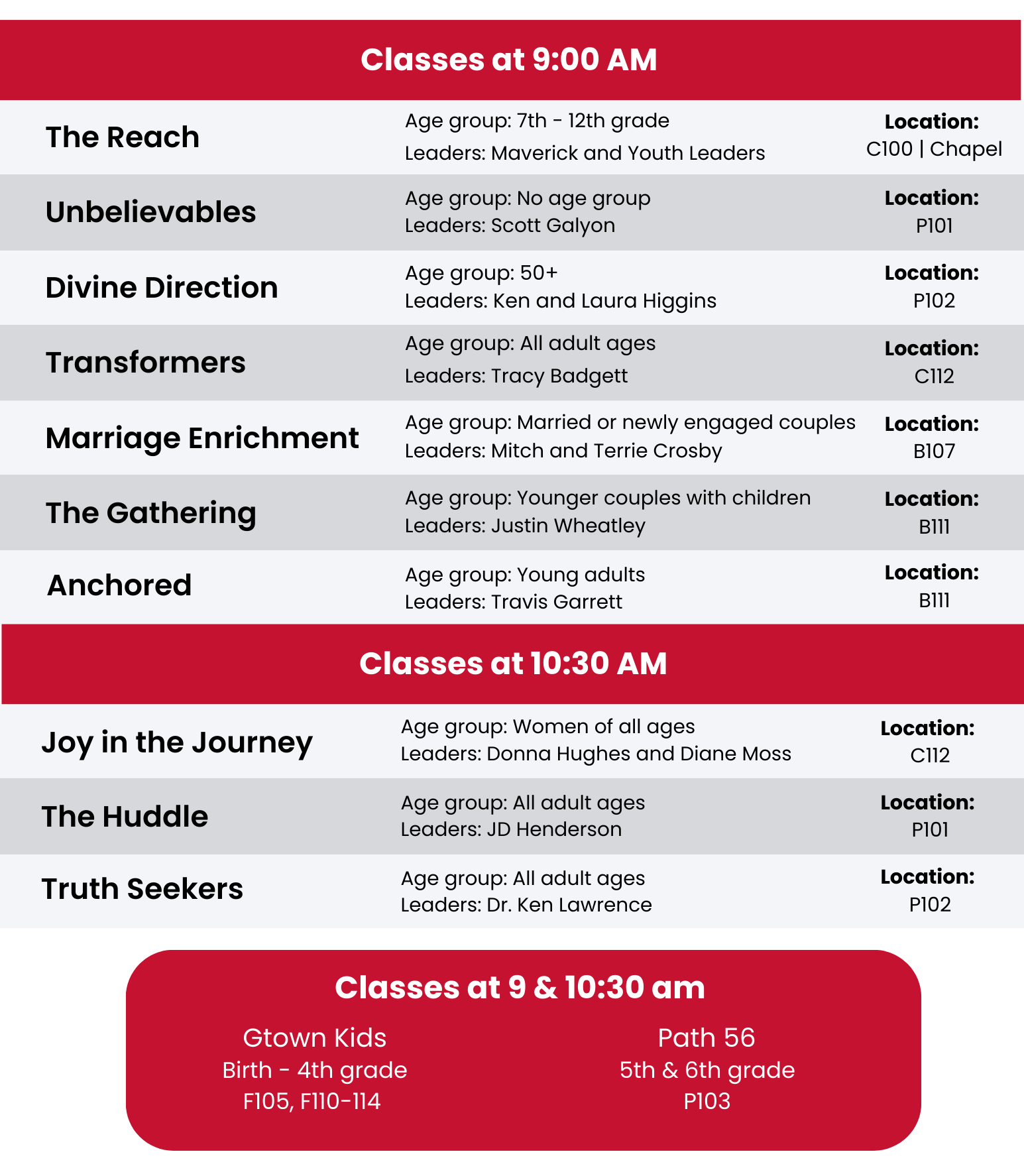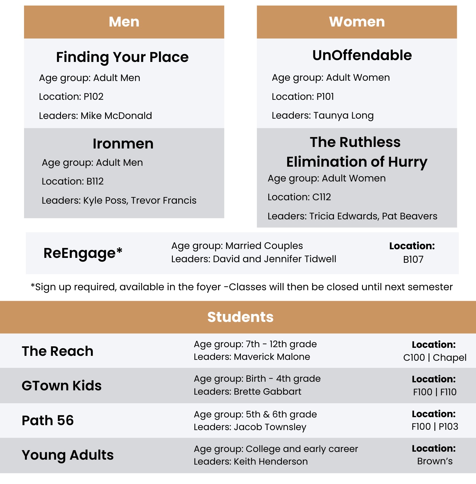 GBC is happy to have a wide selection of Sunday and Midweek Classes for Adults, Young Adults, Teens, and Children. Join us to learn more about Christ and how to apply His example to your life.